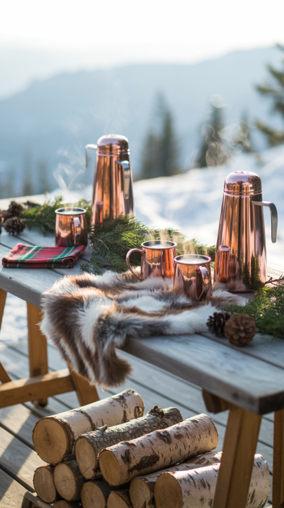 Arrange copper mugs beside brushed brass thermoses for a warm, inviting glow. Simple pine boughs, pinecones, and a few birch logs bring the outdoors in without much effort.