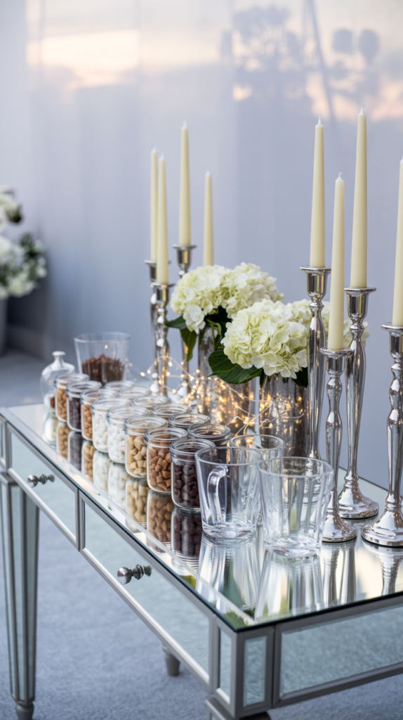 This look turns your hot chocolate bar into a glimmering winter jewel. Set up a mirrored console or a silver-trimmed table to create a bright, elegant base. Use glass jars for toppings and clear glass mugs for serving to keep the setup light and polished.