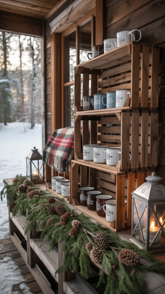 Create cozy cabin charm by turning a porch corner into a warm retreat. A small table or wooden crates work well as the base for your hot chocolate setup. Add enamel mugs, a thermos of cocoa, and a few jars of toppings like marshmallows and crushed peppermint.