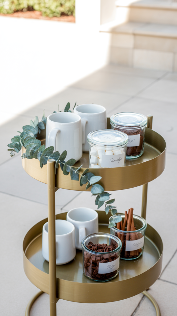 Provide small bowls or jars for toppings like marshmallows, crushed candy, and cinnamon sticks. Clear containers make it easy for guests to see their options. Arrange them in neat rows or tiers to save space.