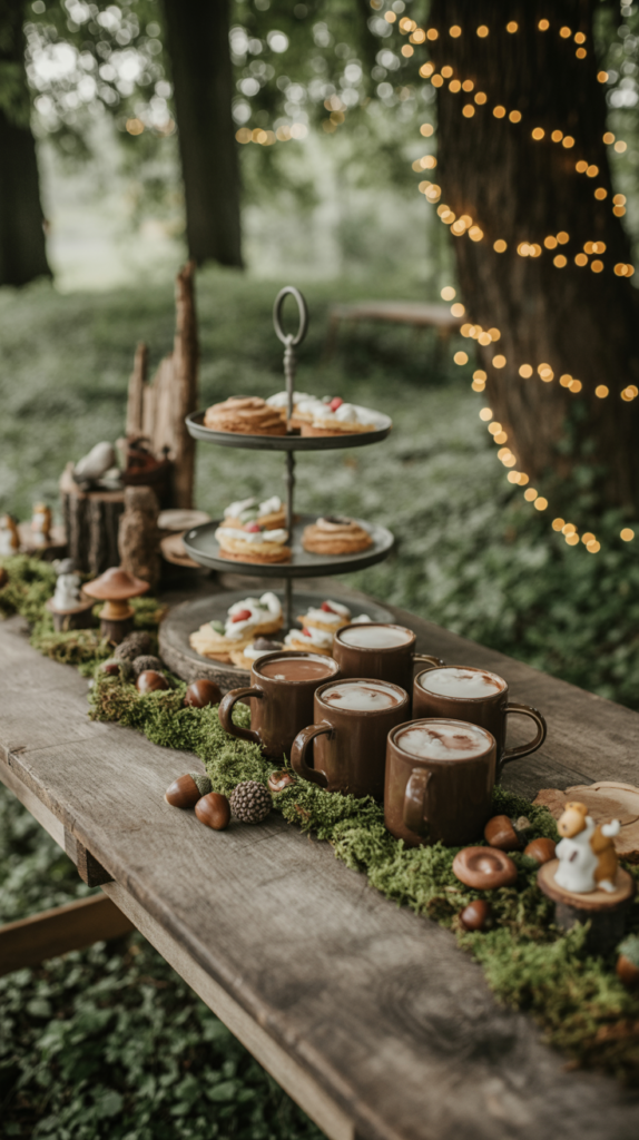 Create a cozy woodland scene that brings the forest to life. Choose a spot near trees or greenery to set the mood. A simple table covered with a moss runner or burlap cloth makes a natural base for your hot chocolate bar.