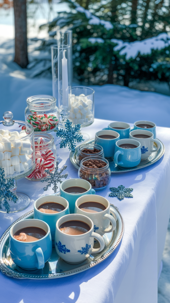 Play soft holiday music in the background and keep a thermos or slow cooker filled with warm cocoa. The setup invites guests to gather, chat, and enjoy a comforting drink that captures the spirit of the season.