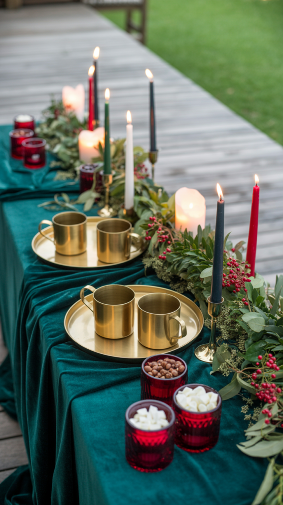 Set gold trays across the table to hold cocoa mugs, spoons, and toppings like whipped cream or cinnamon sticks. Brass or copper mugs reflect the candlelight and make the setup feel festive without being overdone.