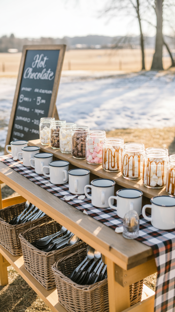 Arrange toppings like marshmallows, crushed peppermint, and chocolate chips in small jars or bowls. Keep spoons in a tin pail for easy access. A slow cooker filled with rich hot chocolate keeps everyone warm while they build their perfect cup.